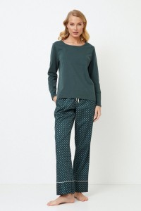 Кофта из мягкого хлопка и полиэстера с округлым вырезом однотонного изумрудного цвета придает изделию элегантности. Брюки выполнены из блестящей хлопчатобумажной ткани изумрудно-зеленого цвета с роскошным геометрическим рисунком. Они украшены потайными карманами, окантовкой в тон и регулируемой талией с золотистыми вставками на манжетах. Длинная пижама Griselle, идеально подходящая для отдыха или сна, гармонично сочетает в себе комфорт и элегантность.