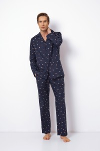 В этой темно-синей пижаме с принтом медведя вы сможете ощутить неподвластный времени стиль! Удобная пижама из чистого хлопка обычного кроя с длинными рукавами и штанинами для тепла. Верх застегивается на пуговицы и имеет мягкий воротник revere. Брюки имеют эластичный пояс и боковые карманы. Изделие выполнено из текстильного хлопка.