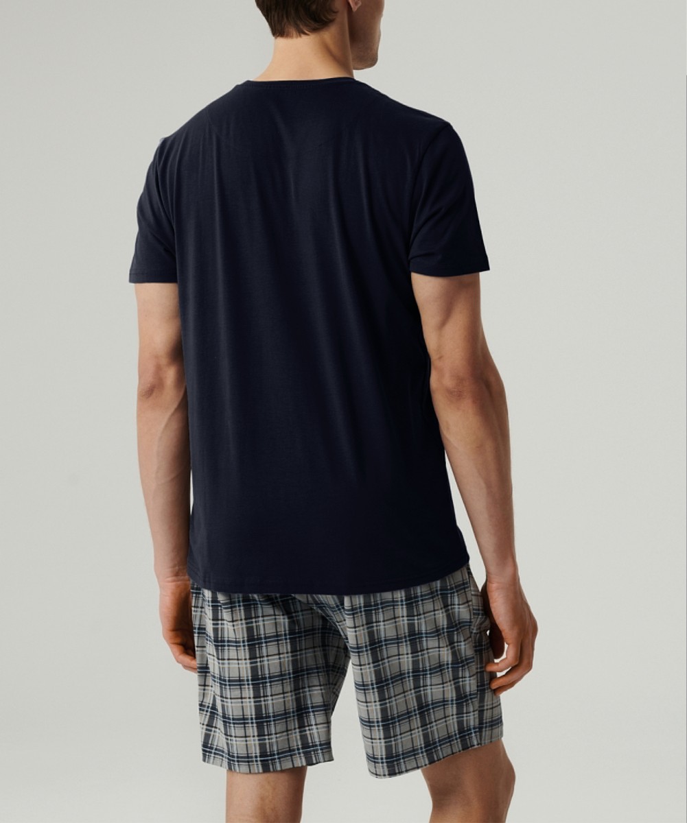 Мужская пижама Atlantic NMP-380 темно-синего и серого цветов из коллекции Homewear - стильный комплект из футболки и шорт для комфортного отдыха и повседневной носки. Комплект изготовлен из 100% хлопка с технологией "вычесывания" для повышенной прочности и эффектом "Peach Effect", создающим бархатистую поверхность для максимального комфорта. Шорты с классическим рисунком в клетку дополнены эластичным поясом на завязках и боковыми карманами, футболка с круглым вырезом легко сочетается с джинсами или спортивной одеждой