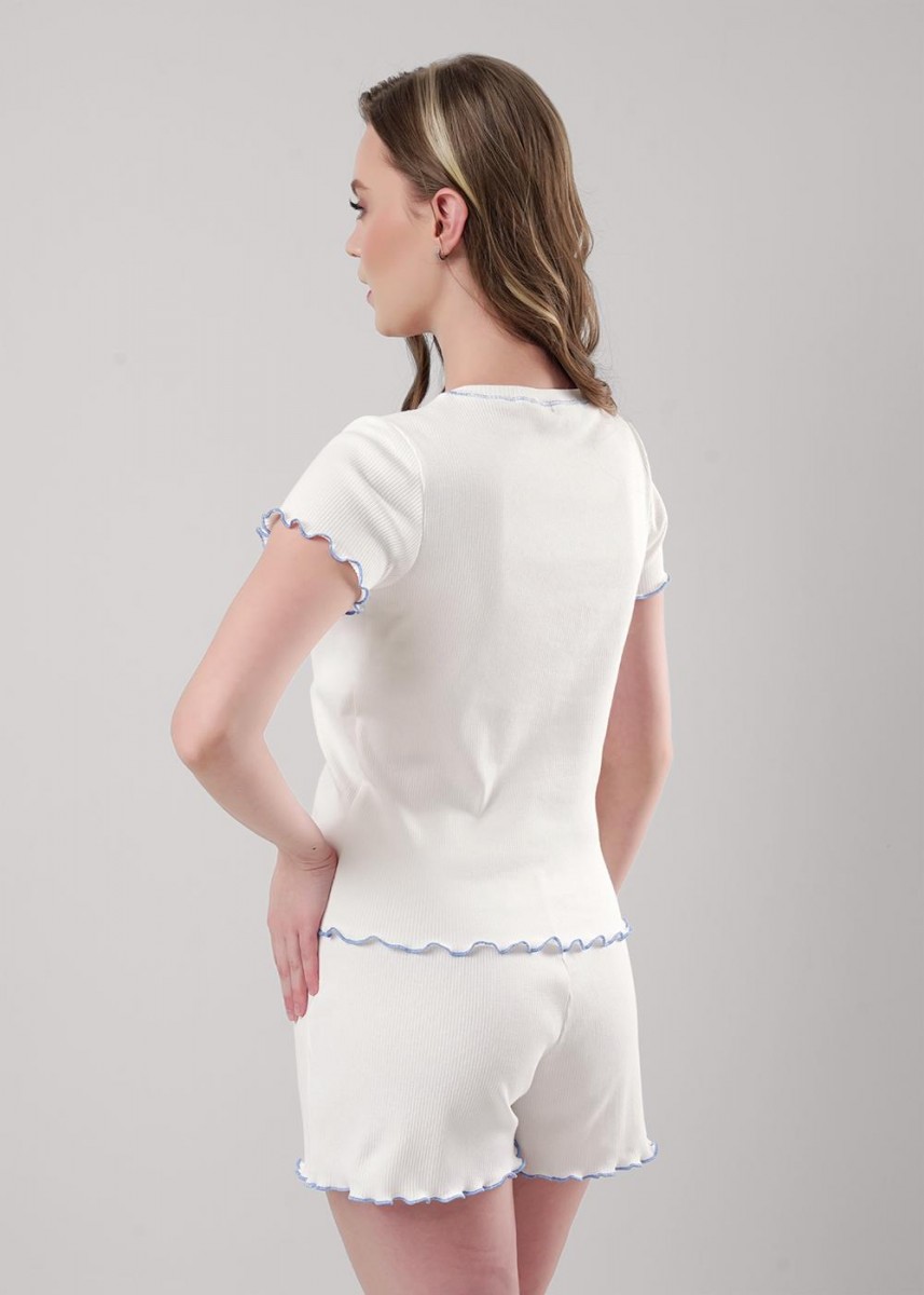 Женская пижама из трикотажного полотна кашкорсе. Футболка прямого кроя с коротким втачным рукавом и круглым вырезом горловины украшена принтом. Прямые шорты дополнены внутренней резинкой. Оригинальность модели придает обработка мелкий оверлок по низу футболки и шорт. Ткань из мягкого хлопка приятна на ощупь и позволяет телу дышать. Небольшое добавление эластана обеспечивает сохранение формы и яркости цвета изделия даже после множества стирок. Эта милая пижама станет отличным решением для отдыха и сна.