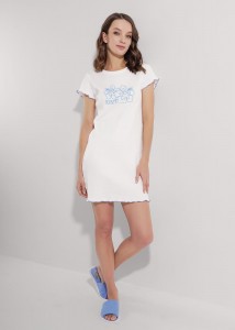Домашнее платье из хлопкового трикотажного полотна с эластаном - кашкорсе. Модель с коротким втачным рукавом и круглым вырезом горловины. Оригинальность платью придает обработка мелкий оверлок контрастными нитками по низу рукава и изделия. Спереди модель украшена принтом. Ткань из мягкого хлопка приятна на ощупь и позволяет телу дышать. Небольшое добавление эластана обеспечивает сохранение формы и яркости цвета изделия даже после множества стирок. Это платье станет отличным вариантом для дома и отдыха.
