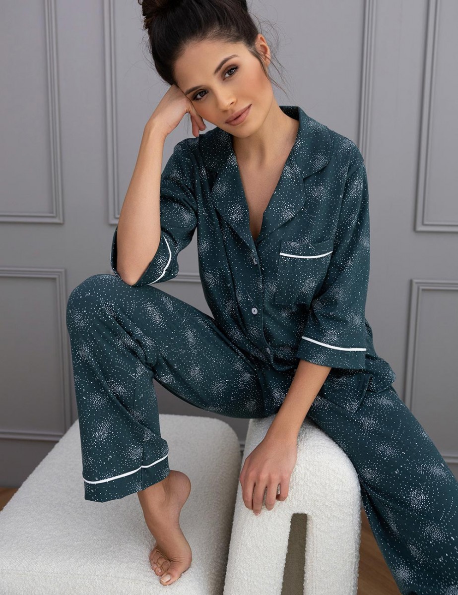 Повседневная пижама Sydney темно-синего цвета состоит из рубашки и прямых брюк. Рубашка на пуговицах, с фигурным воротником и рукавами 3/4. На груди накладной карман. Идеальный вариант не только для сна, но и для домашнего отдыха.