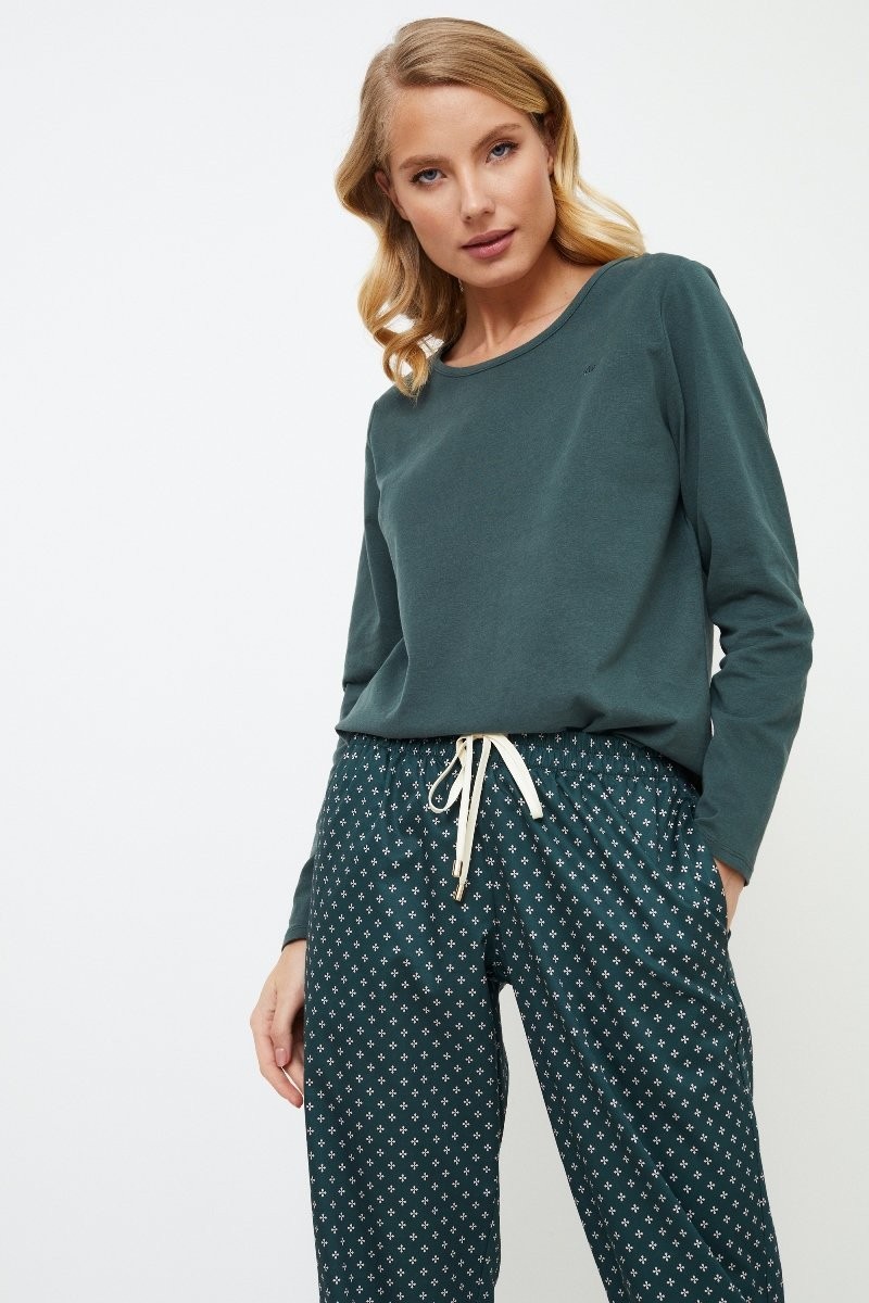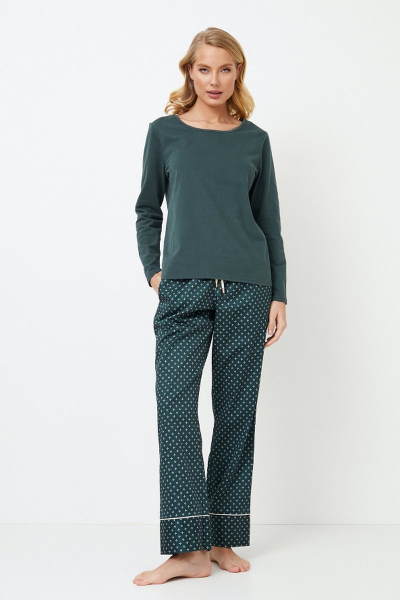 Кофта из мягкого хлопка и полиэстера с округлым вырезом однотонного изумрудного цвета придает изделию элегантности. Брюки выполнены из блестящей хлопчатобумажной ткани изумрудно-зеленого цвета с роскошным геометрическим рисунком. Они украшены потайными карманами, окантовкой в тон и регулируемой талией с золотистыми вставками на манжетах. Длинная пижама Griselle, идеально подходящая для отдыха или сна, гармонично сочетает в себе комфорт и элегантность.