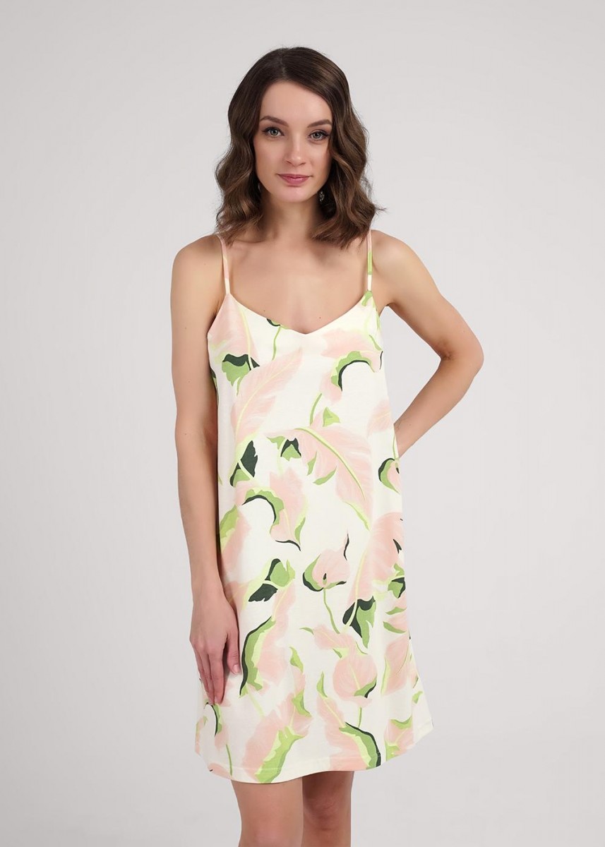 Сорочка ночная из хлопкового трикотажного полотна с добавлением модала, слегка расклешенная книзу. Узкая бретель с регулировкой длины. V-образный вырез горловины с внутренней обтачкой.