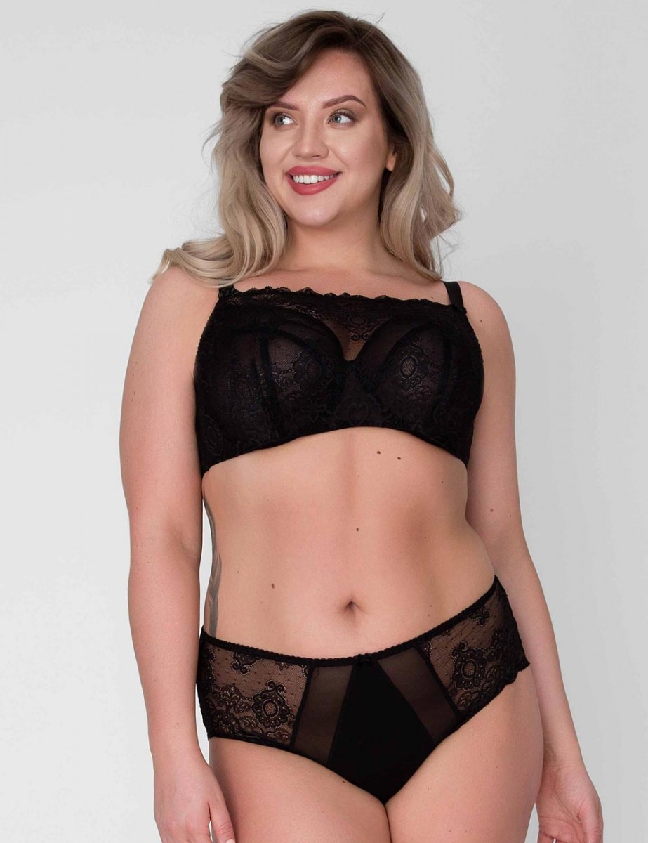 Модный бюстгальтер-топ A-111 M с мягкими вместительными чашками от польского бренда Akcent выполнен из малоэластичного сетчатого полотна черного цвета, снаружи покрыт несъемным черным эластичным кружевом с цветочным узором в виде топа, придающим бюстгальтеру неповторимый и сексуальный вид.