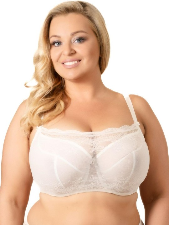 Бюстгальтер-топ с мягкими вместительными чашками от польского бренда Akcent модель A-204 M, выполнен из малоэластичного сетчатого полотна цвета экрю, снаружи покрыт несъемным эластичным кружевом с цветочным узором в виде топа, придающим бюстгальтеру неповторимый и сексуальный вид.