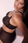 Бюстгальтер из коллекции Chiara M выполнен в черном цвете с мягкими чашечками на косточках, чашки шитые из кружева, продублированы черной сеткой, декорированы тесьмой в тон. Спинка из черной стабилизирующей сетки. Бретельки регулируются по длине, не отстёгиваются. В зоне декольте дополнительные съемные тонкие бретели, регулируются по длине, крепятся между чашками и на спинке, при желании их можно перекрещивать на спине. На спине застёжка на удлинитель, количество крючков в ряду застёжки увеличивается пропорционально размеру бюстгальтера, фурнитура металлическая цвета меди. Бюстгальтер идеально сочетается с трусиками из коллекции Chiara.