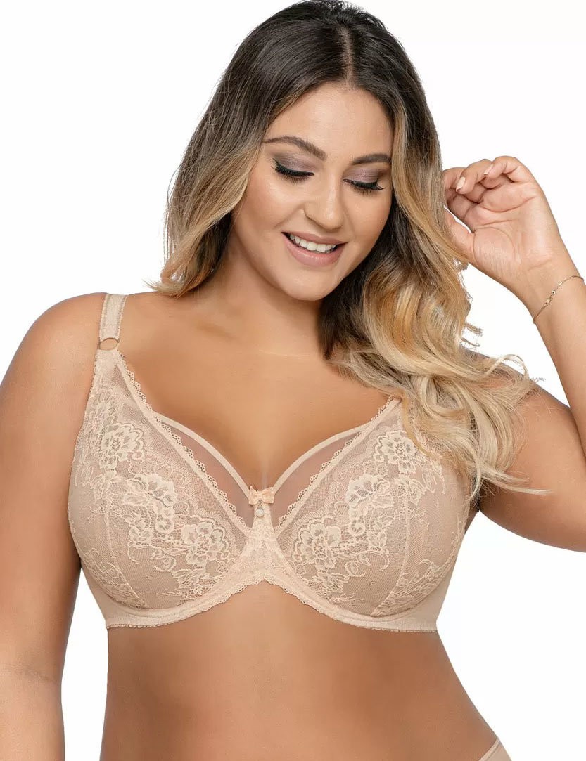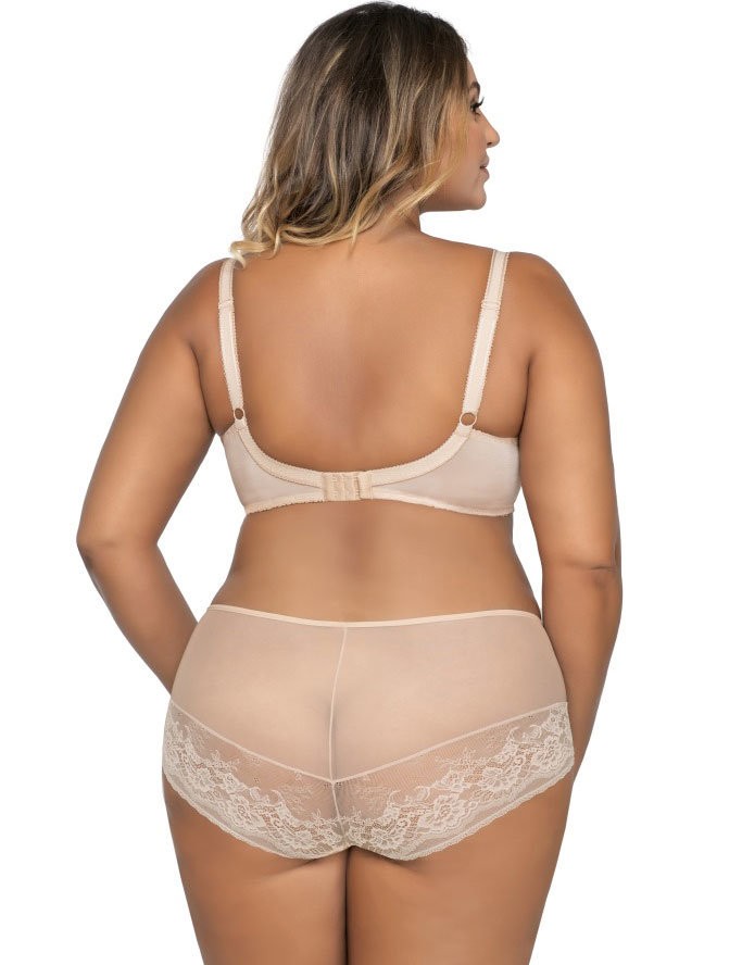 Бюстгальтер dыполнен на косточках, чашки мягкие, шитые из сетки и кружева телесного цвета, бретельки не отстёгиваются, регулируются по длине. На спине застёжка на удлинитель, количество крючков в ряду застёжки увеличивается пропорционально размеру бюстгальтера.