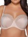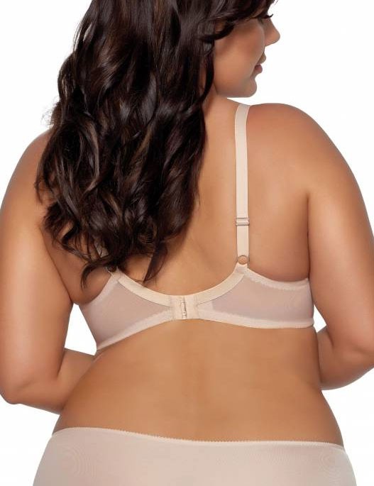 Бюстгальтер выполнен с шитыми мягкими чашками на косточках. Бретельки регулируются по длине, не отстёгиваются. На спине застёжка на удлинитель, количество крючков в ряду застёжки увеличивается пропорционально размеру бюстгальтера. Фурнитура металлическая цвета меди.