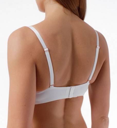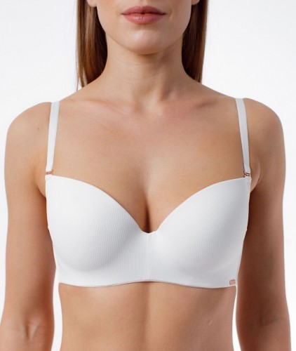 Бюстгальтер с формованными чашками из тонкого поролона со скрытыми каркасами. Выполнен из матовой шелковистой микрофибры. По бокам вертикальные пластины упругости.