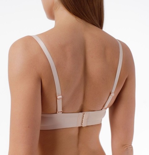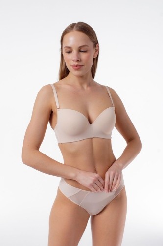 Бюстгальтер с формованными чашками из тонкого поролона со скрытыми каркасами. Выполнен из матовой шелковистой микрофибры. По бокам вертикальные пластины упругости.