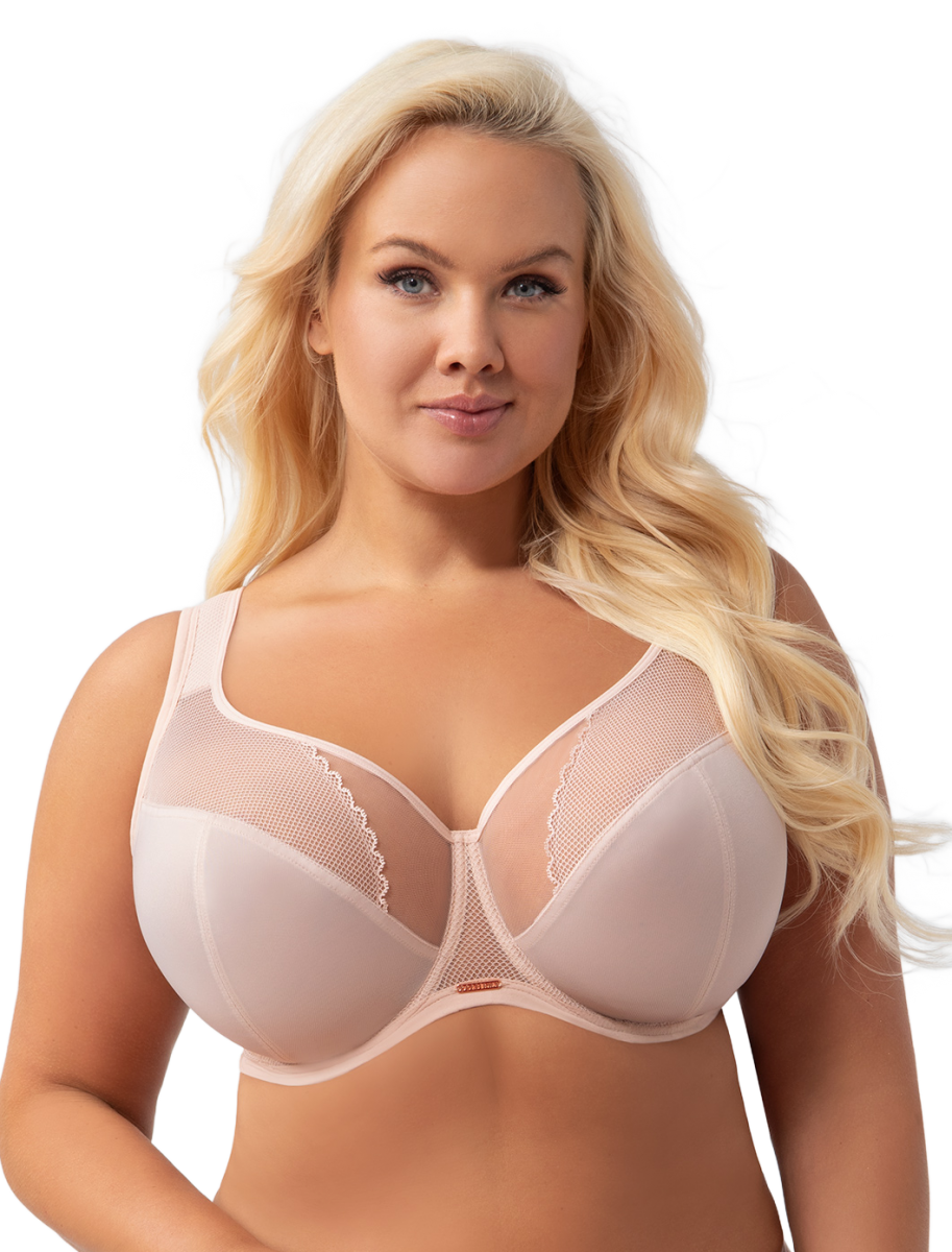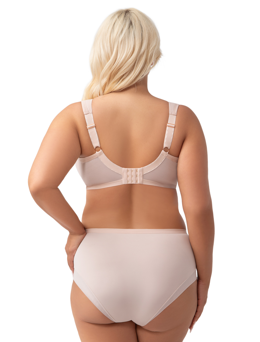 Классический бежевый бюстгальтер с тонким узорным кружевом на сетке. Широкие комфортные бретели уплотнены тонким поролоном.