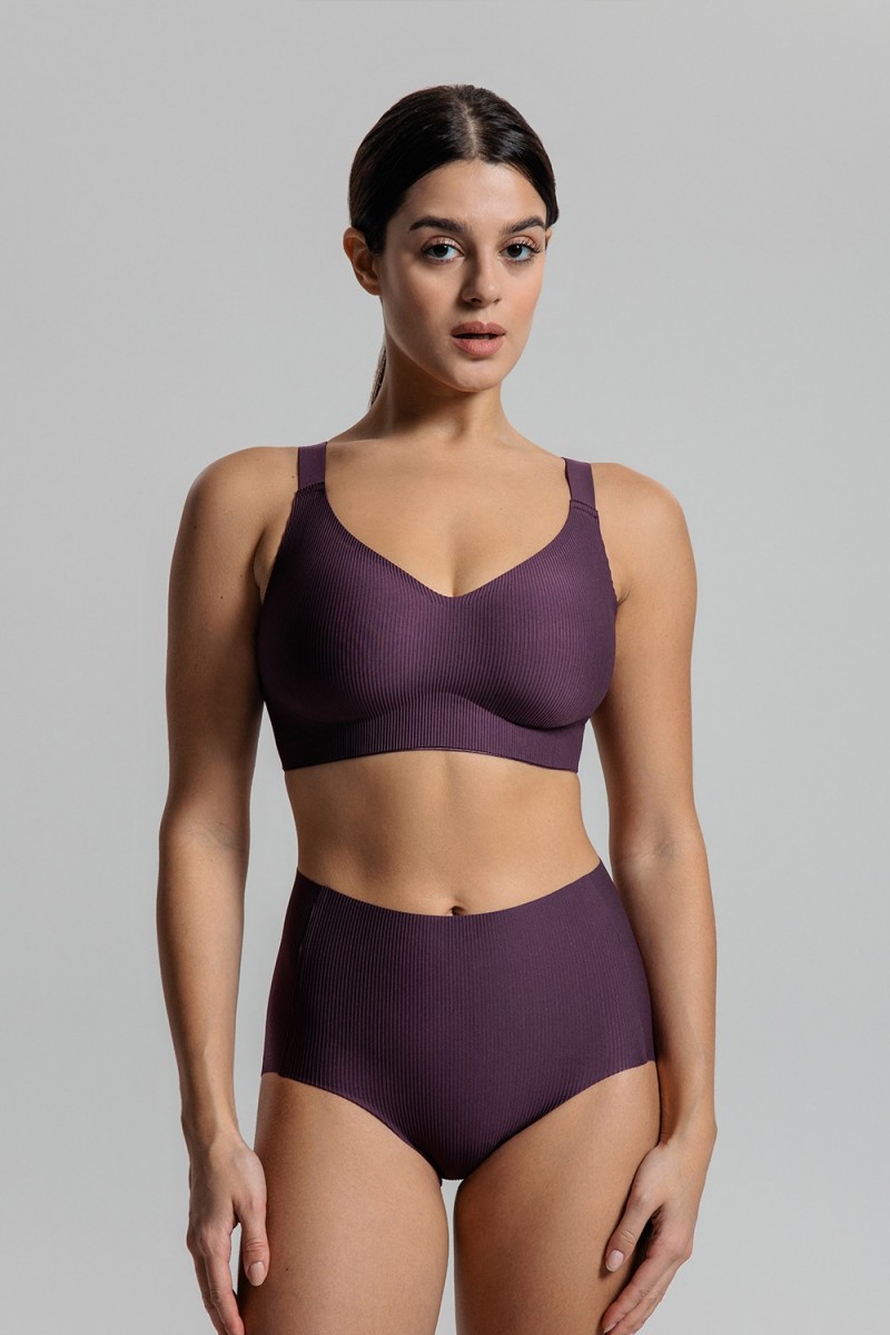 Бесшовный бюстгалтер с V-образным вырезом из микрофибры в рубчик. Силиконовые вставки создают дополнительную поддержку груди. В комплекте съемные латексные вкладыши. Широкая спинка в форме леотард. Комфортные бретели исключают натирание и сдавливание плеч.