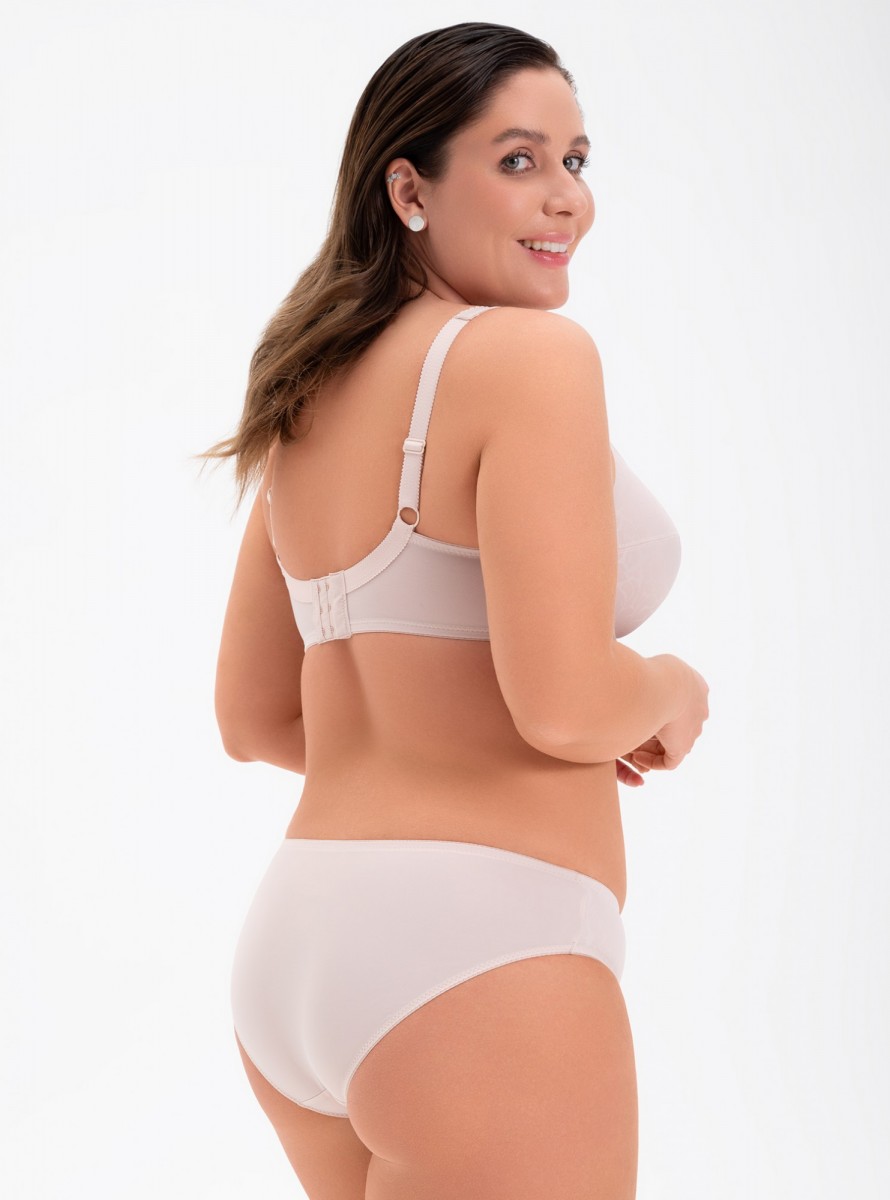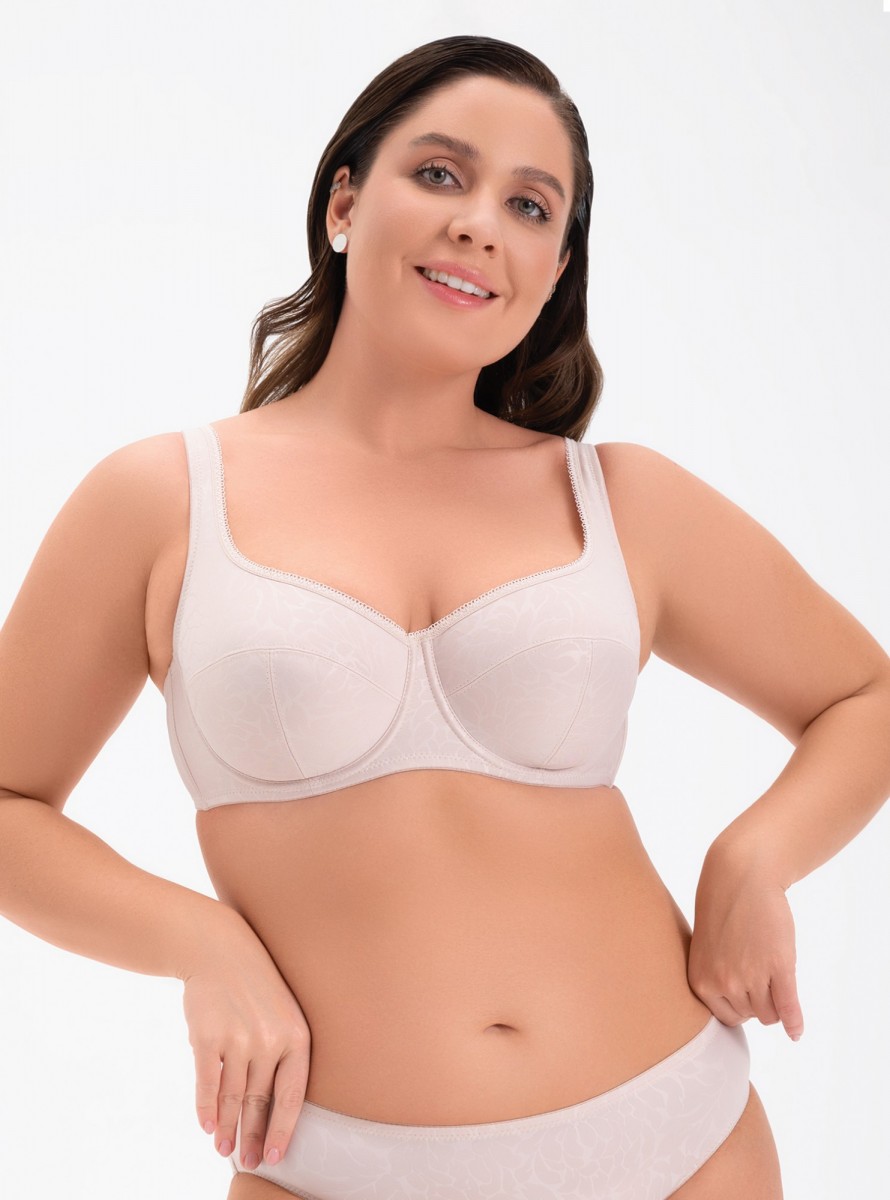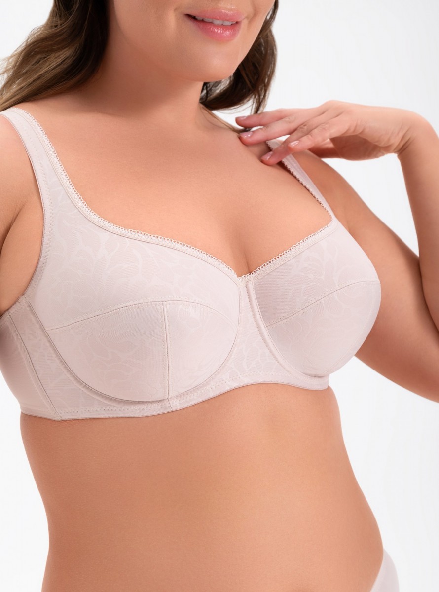 Бюстгальтер с мягкой чашкой на каркасах выполнен из функционального трикотажного полотна с тиснением и эластичного функционального полотна. Широкие бретели значительно уменьшают нагрузку на плечи. Боковые детали усилены стержнями, что препятствует их скручиванию. Кареобразный вырез обработан декоративной тесьмой