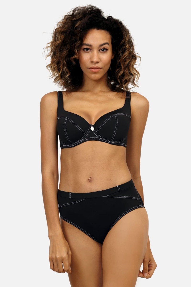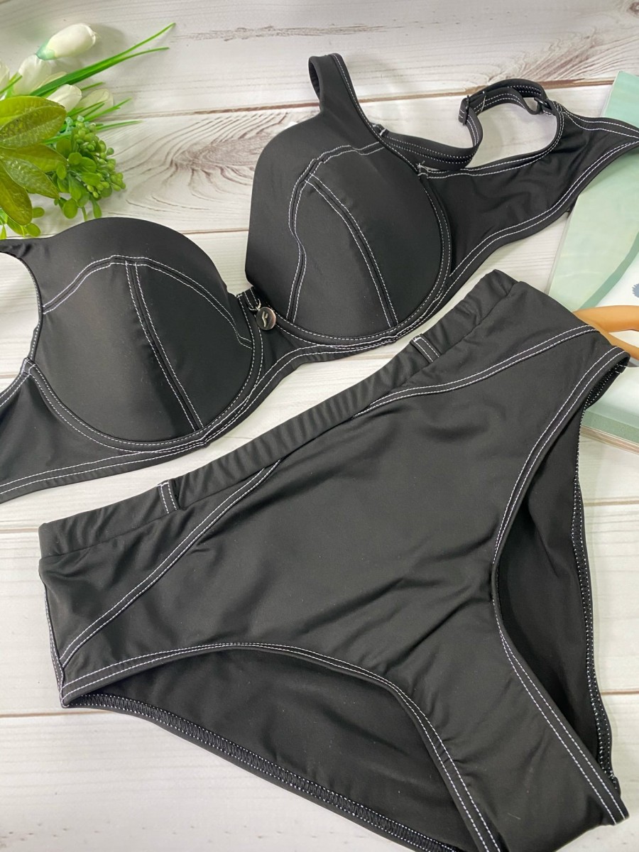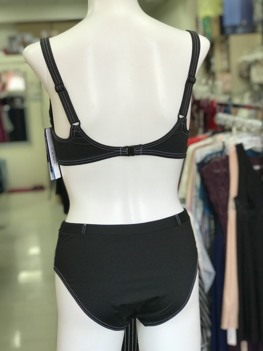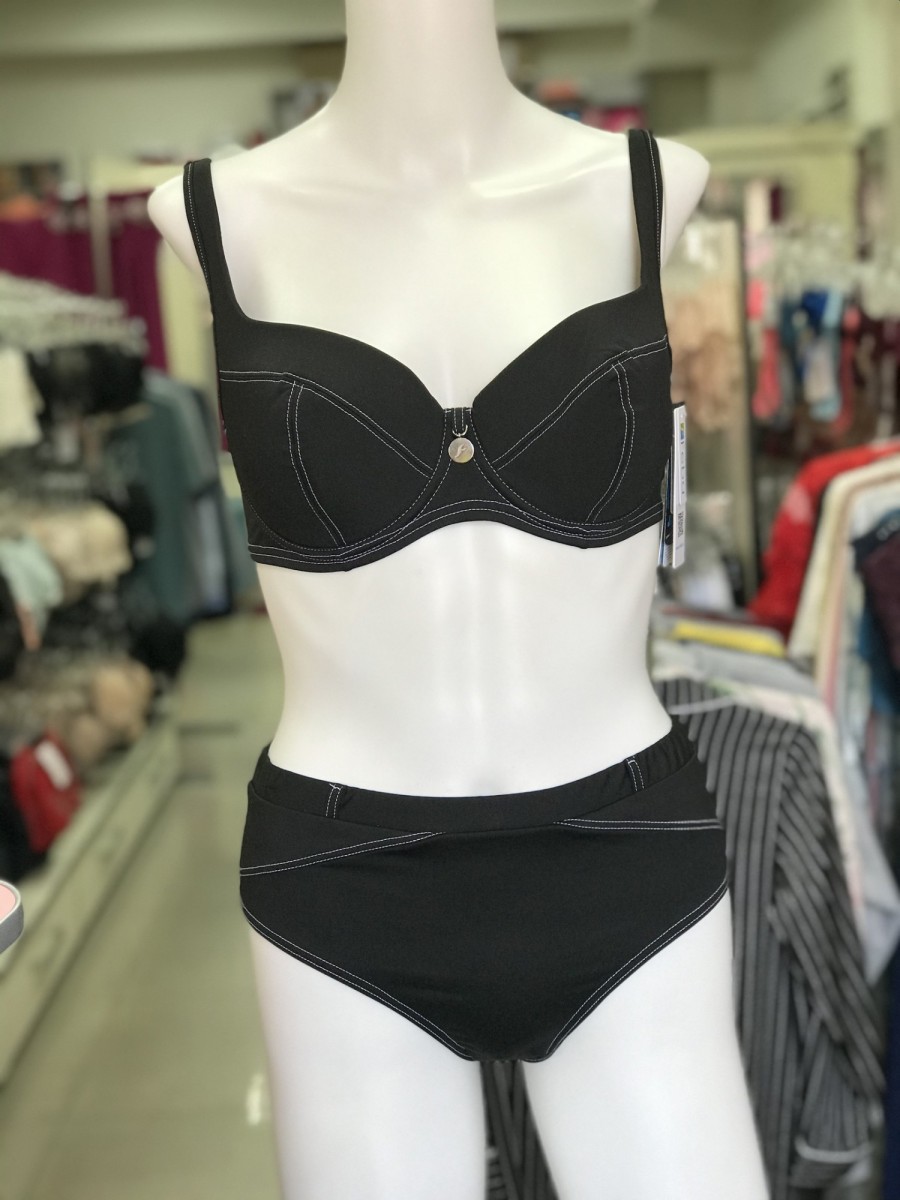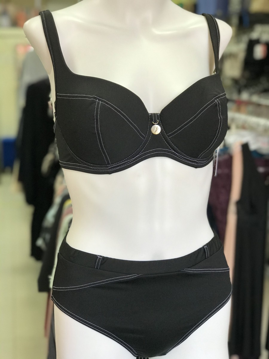 Купальник раздельный на поролоновой чаше, частично укрепленный, с регулируемыми лямками. Благодаря косточкам и вертикально-горизонтальному разрезу чашки, он отлично поддерживает бюст, поэтому он специально предназначен для женщин с очень большой чашкой. Тонкие, декоративные, деревянные бусины на соединении чашек и закрытие периметра под бюстом с практичной застежкой.