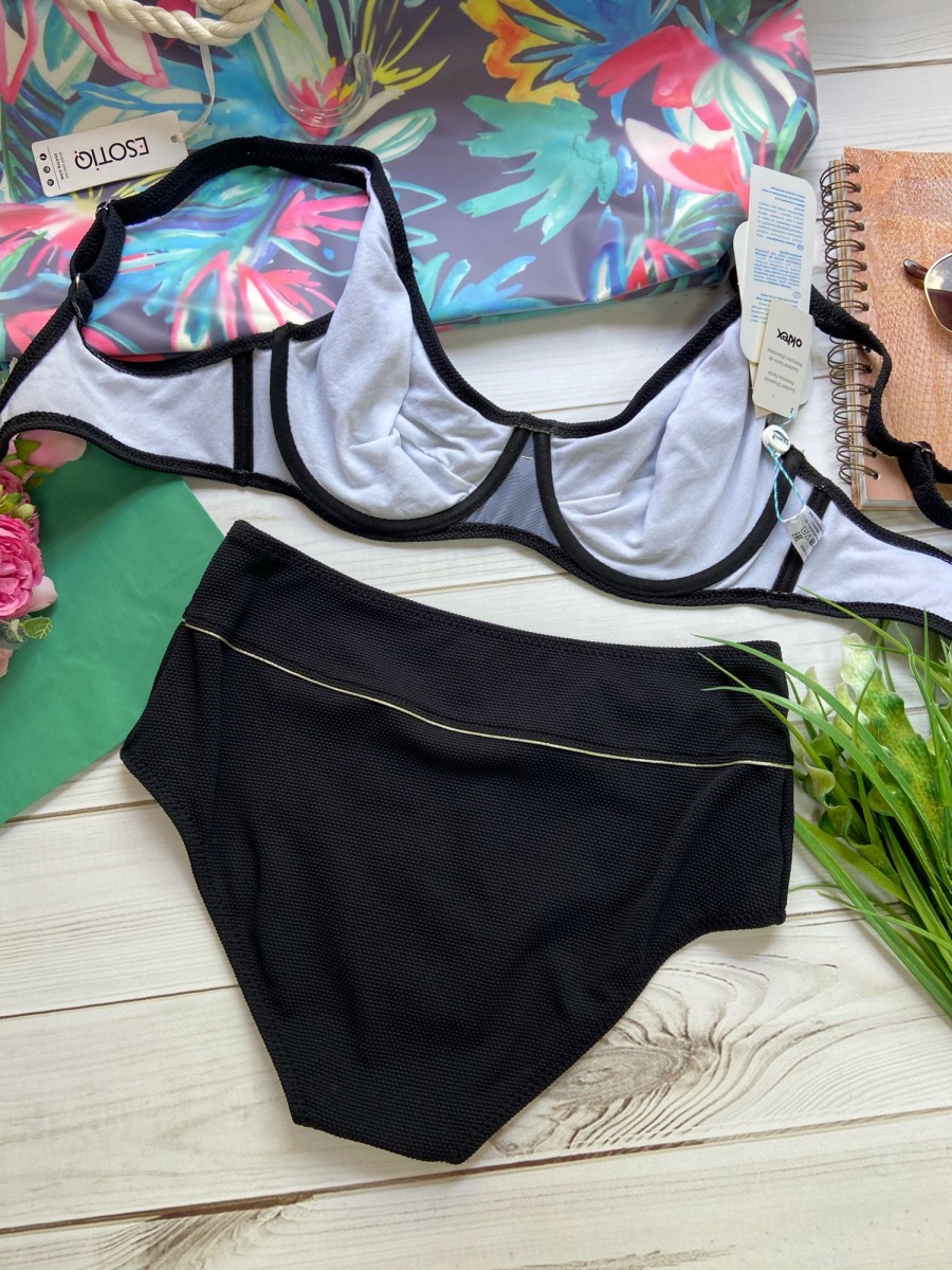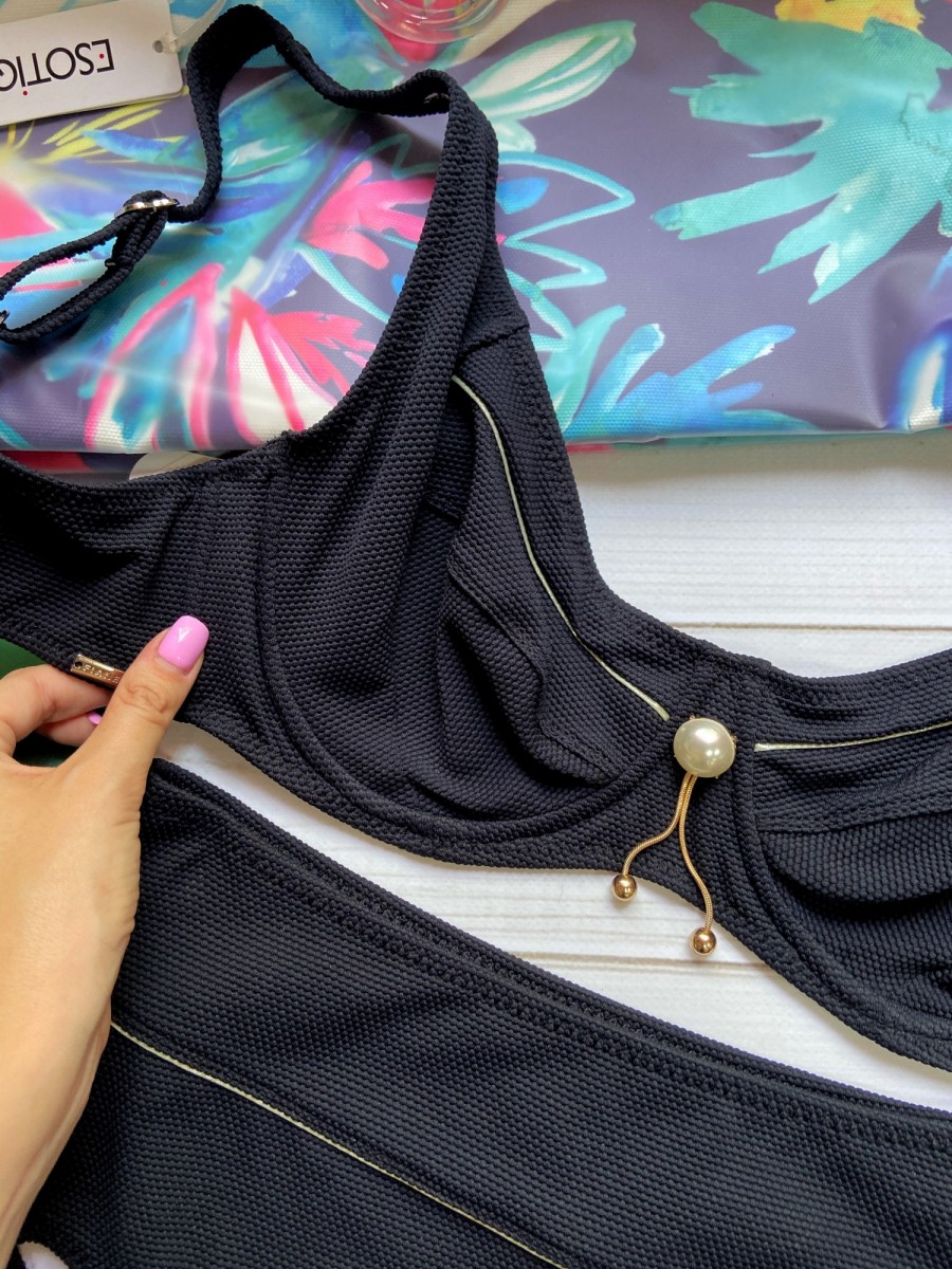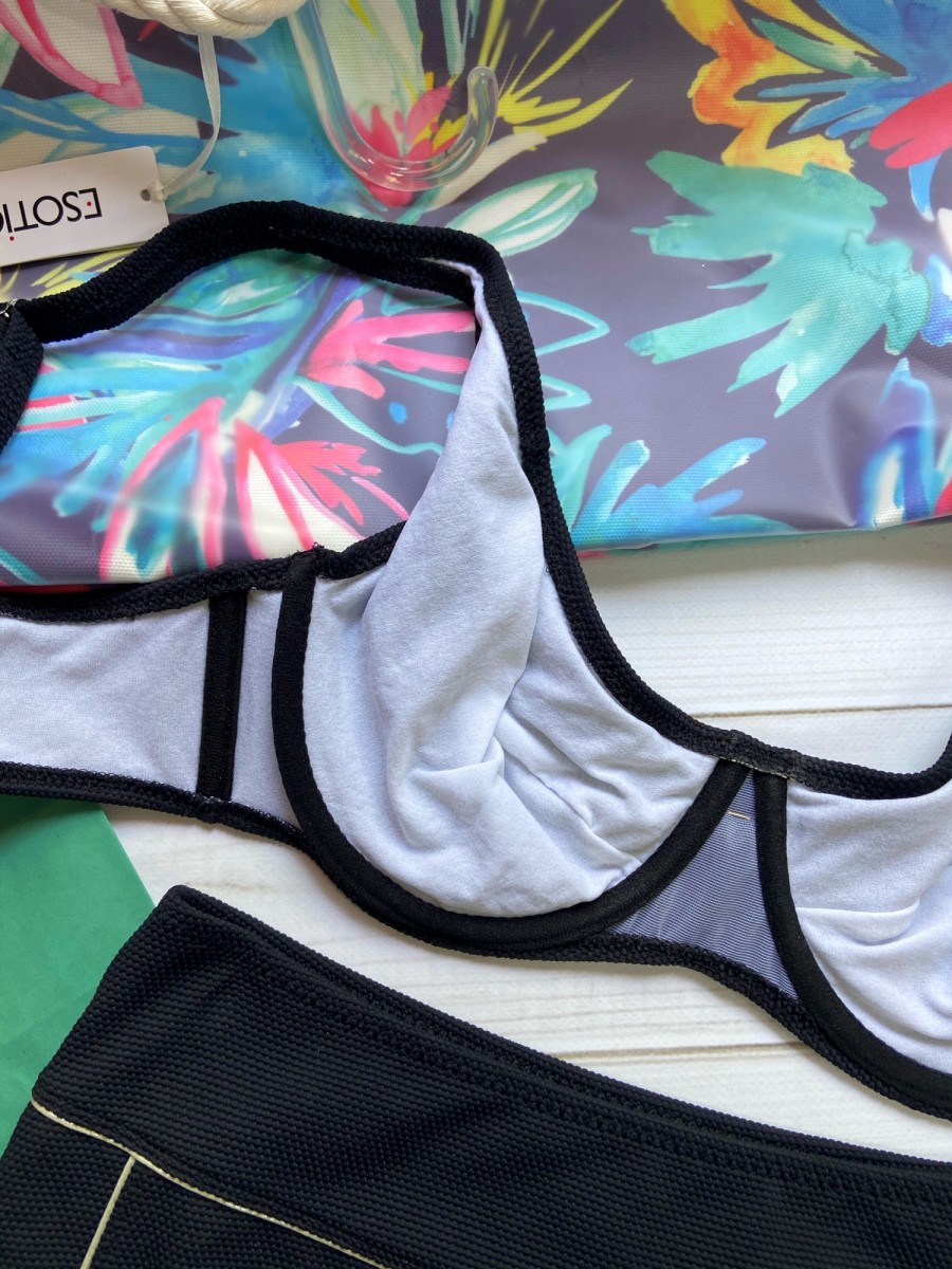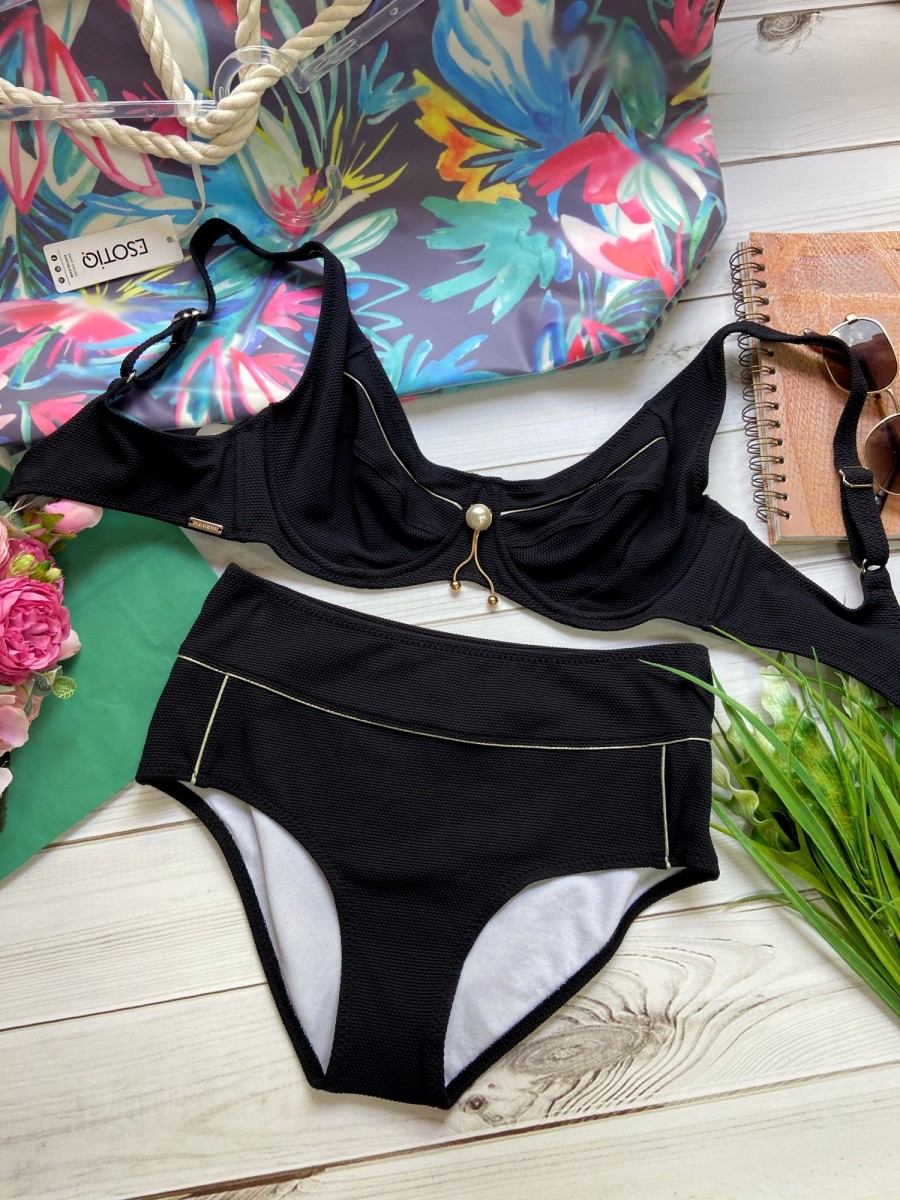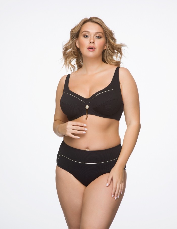 Раздельный купальник на каркасах с мягкой чашкой без уплотнения, выполнен из инновационной фактурной ткани "PIQUET", с нанесенными золотыми или серебряными точками. Лиф полностью дублирован подкладочной тканью. Бретели с регуляторами и широкая металлическая застежка позволяет идеально подогнать посадку лифа на любую грудь. Боковая косточка не позволяет скатываться ткани на боку лифа. Трусы средней посадки имеют возможность регулировки по ширине бочка и полностью дублированы подкладочной тканью