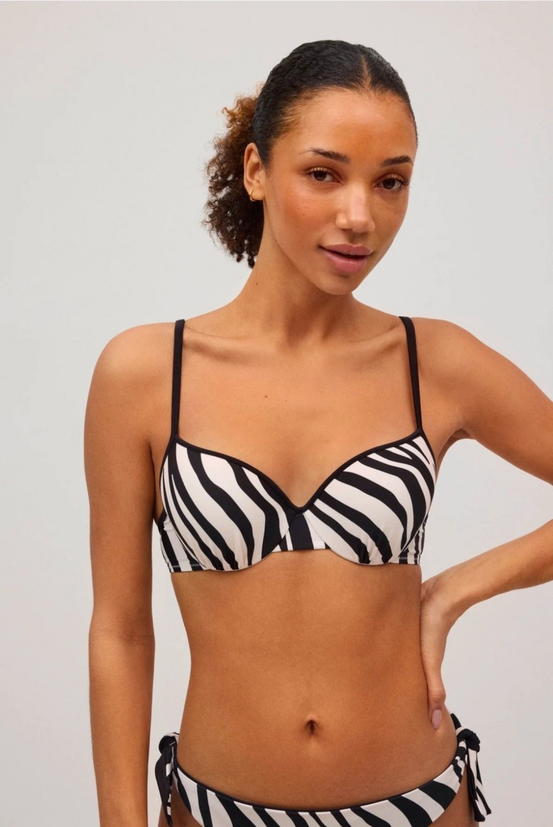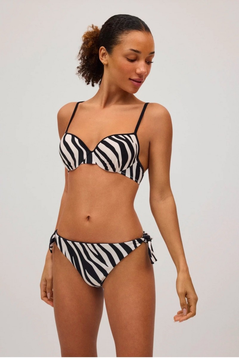 Купальник от испанского бренда Ysabel Mora модель выполнен из быстросохнущего эластичного полотна с анималистическим принтом «зебра». Отличается элегантностью и удобством - формованные чашки помогают создать красивый силуэт груди, повторяет контуры, придаёт ей округлую форму и поддерживает. Плавки бразилиана в комплекте