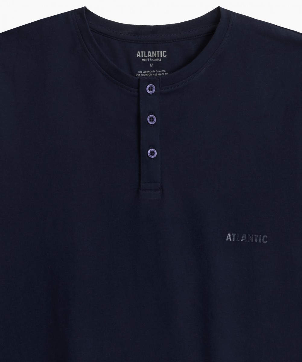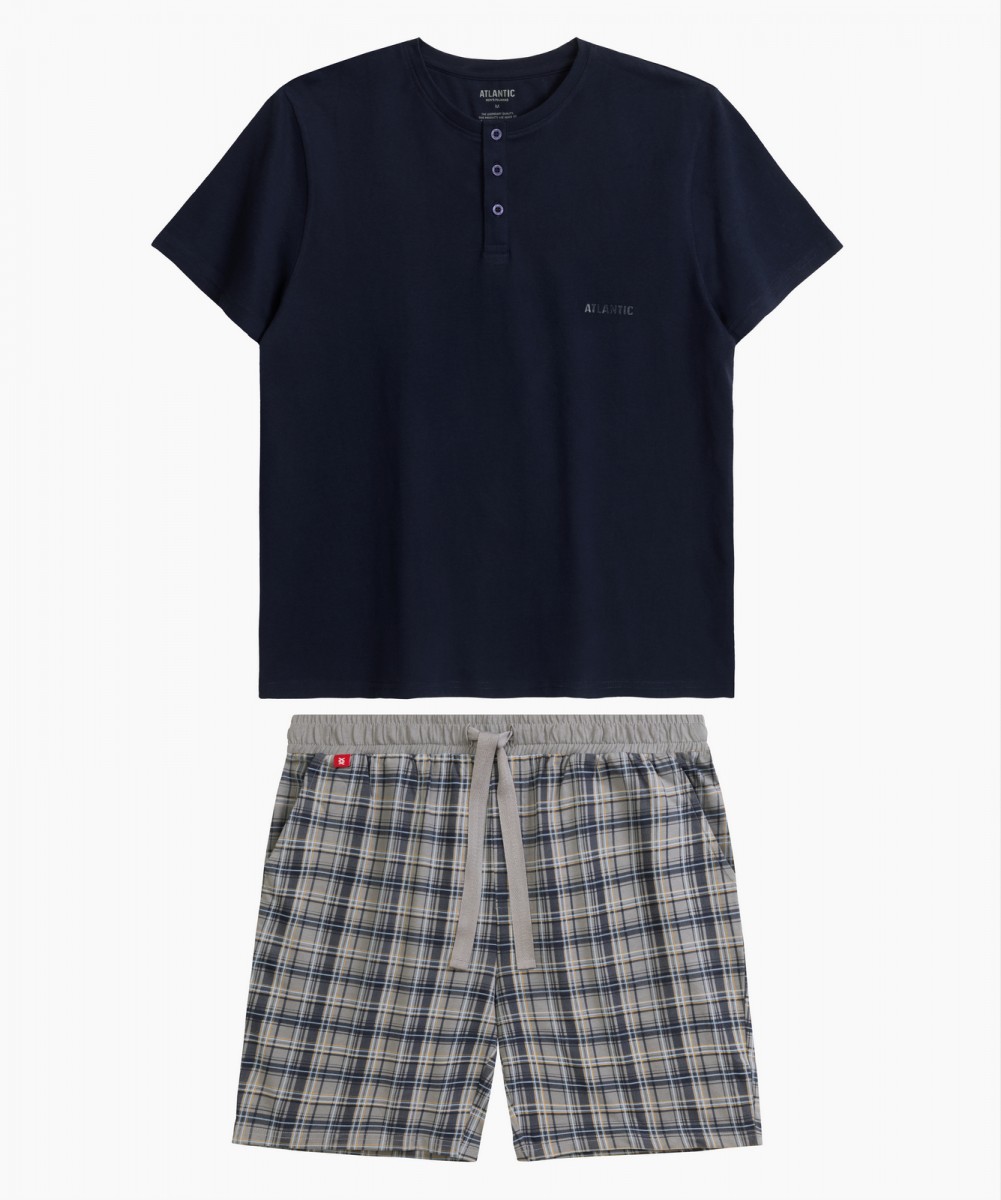 Мужская пижама Atlantic NMP-380 темно-синего и серого цветов из коллекции Homewear - стильный комплект из футболки и шорт для комфортного отдыха и повседневной носки. Комплект изготовлен из 100% хлопка с технологией "вычесывания" для повышенной прочности и эффектом "Peach Effect", создающим бархатистую поверхность для максимального комфорта. Шорты с классическим рисунком в клетку дополнены эластичным поясом на завязках и боковыми карманами, футболка с круглым вырезом легко сочетается с джинсами или спортивной одеждой