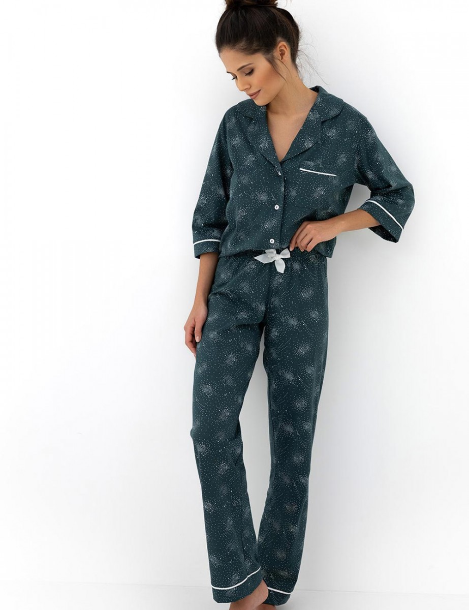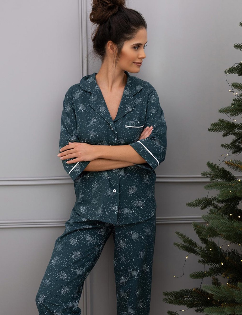 Повседневная пижама Sydney темно-синего цвета состоит из рубашки и прямых брюк. Рубашка на пуговицах, с фигурным воротником и рукавами 3/4. На груди накладной карман. Идеальный вариант не только для сна, но и для домашнего отдыха.
