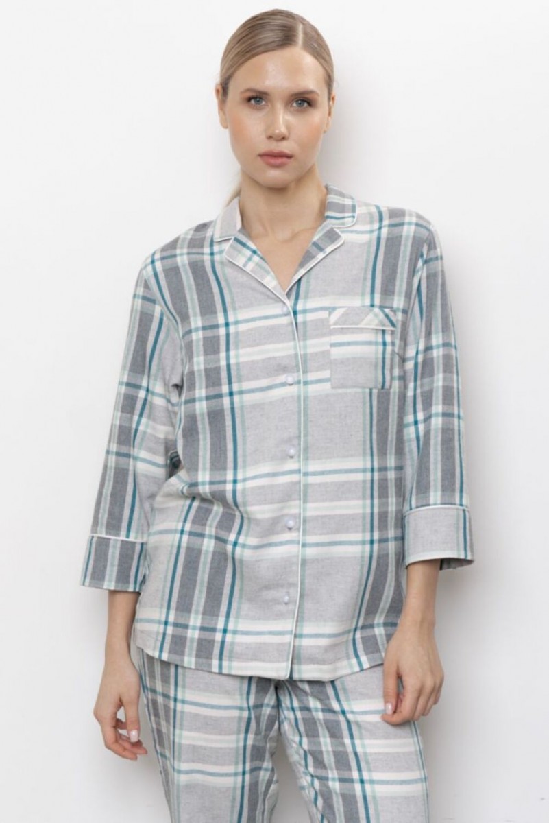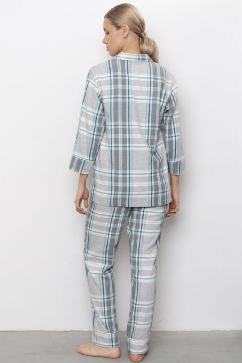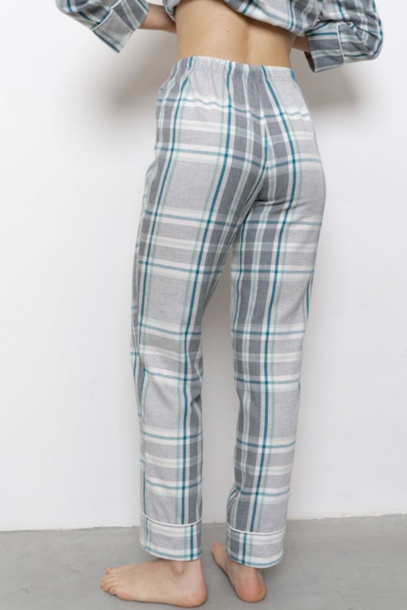 Фланелевая пижама состоит из рубашки на пуговицах и брюк. У рубашки английский воротник, на груди карман. Пижама декорирована контрастными пуговицами и белым кантом. Брюки прямые, свободного прилегания, на резинке.