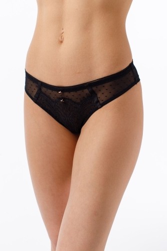 Трусы-бразилиана со средней линией талии, выполнен из эластичного кружева и эластичной сетки. Украшение металлические пуговицы.